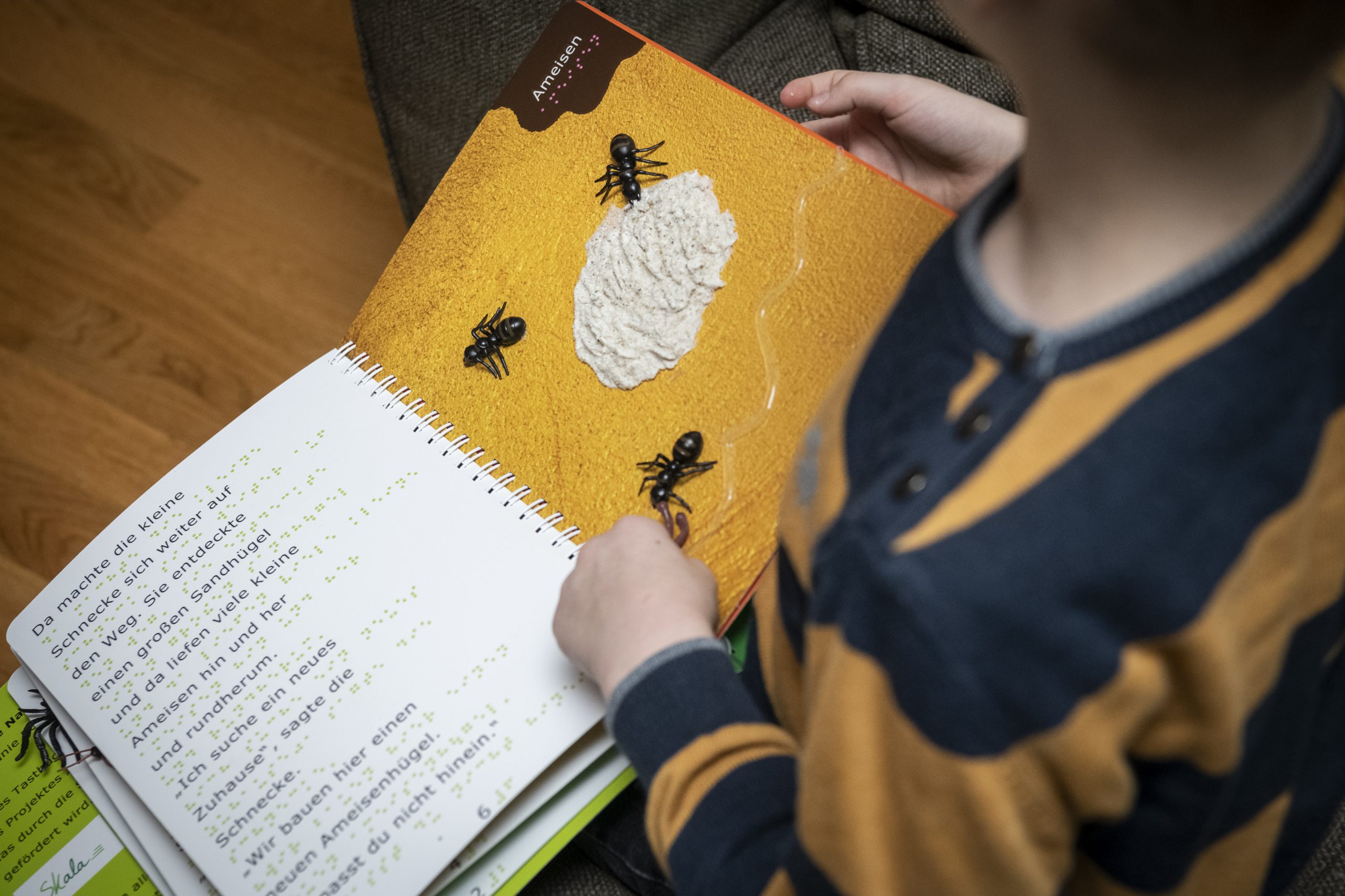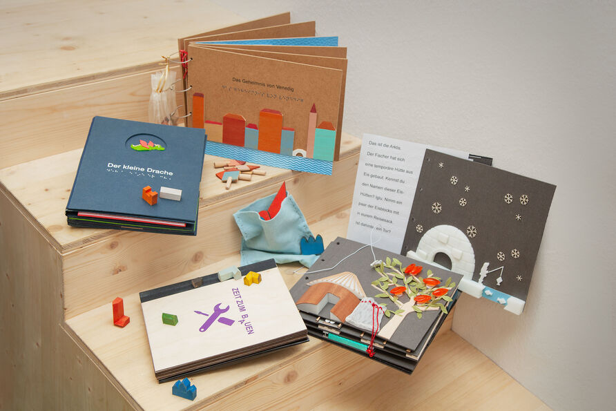 Die Herstellung ist aufwendig – jedes Buch wird in kleinen Auflagen produziert, mit taktilen Elementen, Brailleschrift und Schwarzschrift kombiniert.