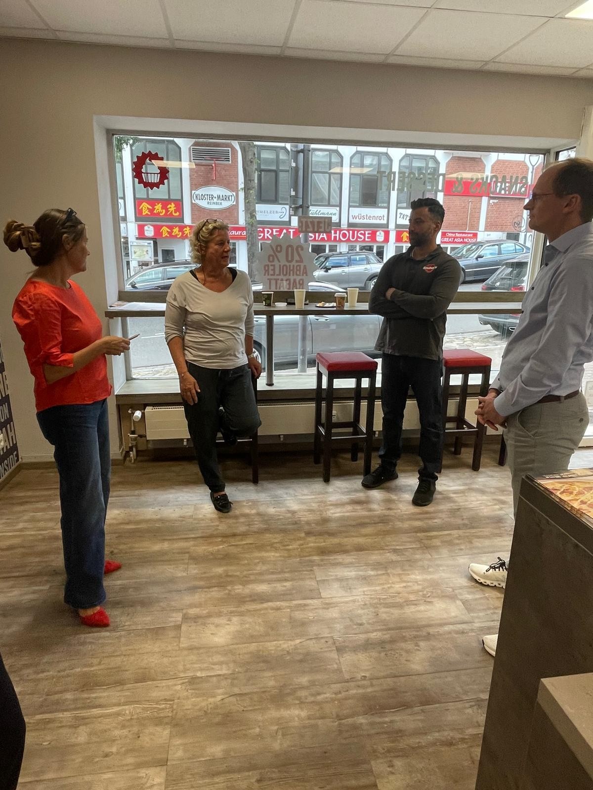 Der Bundestagsabgeordnete Henri Schmidt hat gemeinsam mit Andrea Schemion, Geschäftsführerin von Smiley’s Pizza, Nicole Thomas, Geschäftsführerin des VBUW, sowie Burhan Amiri, Geschäftsführer des Smiley’s Stores in Reinbek, den Standort in Reinbek besucht. Im Mittelpunkt stand ein ausführliches Gespräch über die dringend notwendige Digitalisierung und den Abbau von Bürokratie, bevor zum Abschluss gemeinsam eine Pizza gebacken und gegessen wurde.
